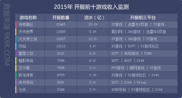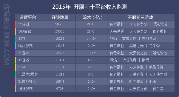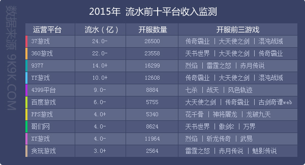 评论:本年度9377凭借旗下主打游戏《烈焰》、《雷霆之怒》的抢眼表现,在平台流水收入榜上位列第三,收获超过14亿的好成绩。相比于去年而言,YY游戏的流水收入依然保持在10亿以上的水平,在两款大热的主打游戏《传奇霸业》、《大天使之剑》的保驾护航下,2016年YY游戏的流水收入值得期待。