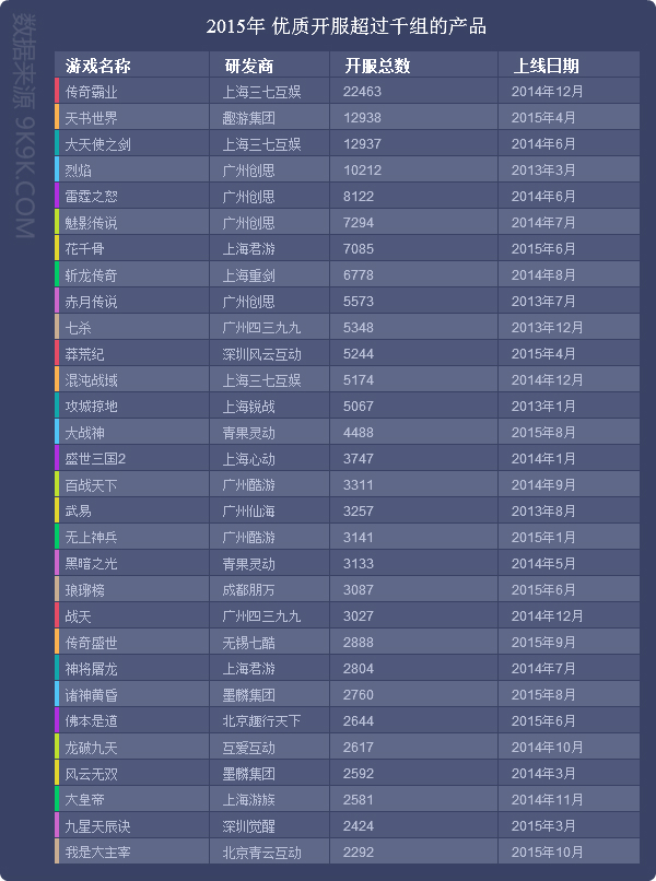 评论:据9K9K网页游戏开服数据统计2015年优质开服超过千组的产品共有55款,比去年多14款。榜单上看,有接近半数的产品为2014年上线,但这些游戏的上线时间多为2014年年底。榜单上游戏,其中像《传奇霸业》、《天书世界》、《花千骨》等这些游戏无论是从流水收益还是开服数量上来说,都证明了这些游戏的优秀。