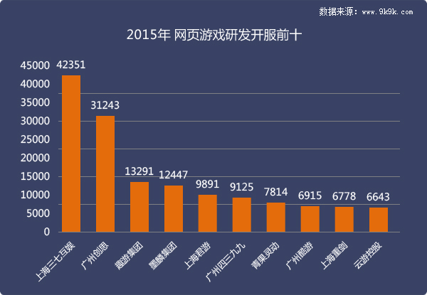 评论:2015年各地区研发水平分布耐人寻味:首先从榜单数据可见广州、上海、浙江、北京等地区出生的网页游戏总体开服数量有数倍于2014年的开服成绩,一方面网页游戏市场中尚有一席之地供创业公司发展扩大,另一方面巨头公司在不遗余力加强旗下作品的品质的同时不断提升其运营宣传能力,吸纳了更多的玩家进驻以提高整体开服数据。
