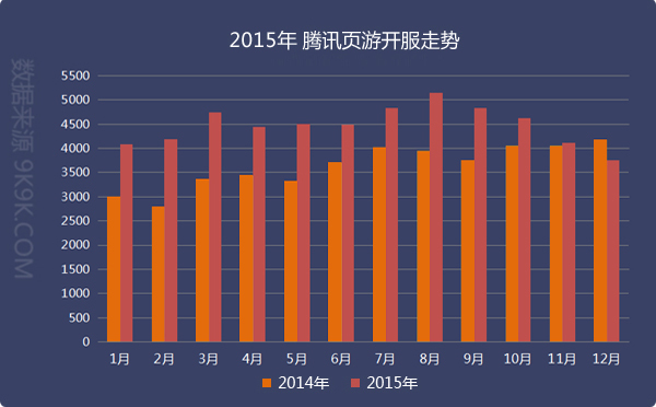 评论:较2014年度相比2015年度腾讯开服数据在数量上依然保持着增长,总体来说腾讯页游在2015年的开服走势是趋于稳定且上升的。腾讯游戏作为行业标杆一样的存在,它的动向往往会影响整个行业。继2014年腾讯游戏涉足PC端,移动端游戏后,就在今年它已悄然把目光转向第三端--电视游戏。这是否意味着将来网页游戏可以搬上电视的荧屏,享受大屏游戏的快感?