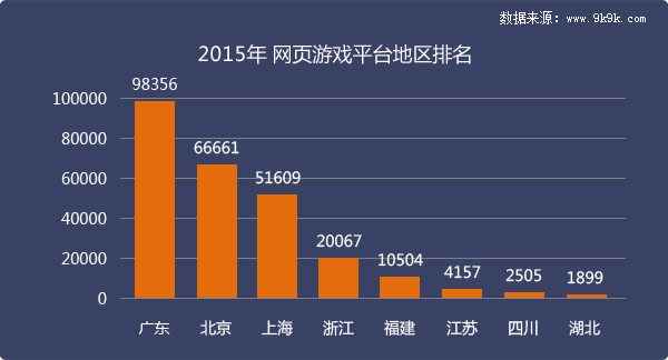评论:2015年度广东地区网页游戏运营平台开服总数较去年增长了8.4%,以目前网页游戏市场整体发展趋势来看来年突破10万组指日可待。网页游戏平台发展能力与地区整体经济水平发展能力成正比关系,北上广地区平台如37游戏、9377、 360游戏除了借由其本身名气更易获得优质游戏的“投怀送抱”,也在线下推广中拥有一定优势:如37游戏曾为旗下《大天使之剑》进行规模较大的户外广告投放,其同期开服、流水数据及用户活跃度相应有较为明显的提升。