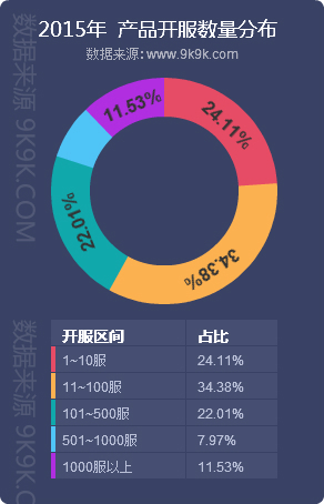 评论:纵观2015年产品数量分布,开服11-110组区间的游戏占比最大,达 34.38%。相对而言,开服1000组以上的游戏占比只有11.53%,但较去年增长4.63%,增长数字看似不大,但对于页游市场来说却是一个十分巨大的进步。一个网页游戏能开服千服以上就足以说明它的市场认可度和商业价值是极高的。在如今市场竞争激烈,垄断格局越来越明显的情况下,运营商如何让自己的产品得到最大的收益,要从各方面着手,而不是简单地将游戏进行换皮。