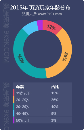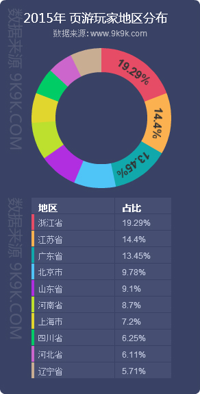 评论:本年度网页游戏玩家地区分布整体变化不大,浙江省占据近二成市场,北京市与山东省本年度排名发生互换。新增上榜分布地区辽宁省,可见网页游戏玩家南北分布差距逐渐减小,网页游戏受众群体进一步扩大。
