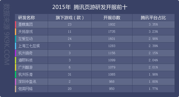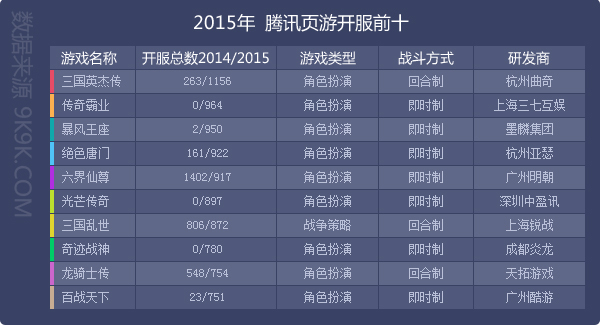 据9K9K网页游戏数据中心统计腾讯年度总开服53831组