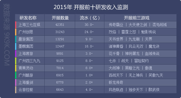 评论:本年度《传奇霸业》荣登开服数与流水收益双料冠军,无论是在开服数量上还是流水收益上都远远超过其他页游,《传奇霸业》自2014年12月开始运营以来其流水收入曲线便不断拔高,2015年总流水收入更是达到了惊人的15亿。排第三位的《大天使之剑》流水收益逼近10亿,同样是表现不俗。而37游戏正是凭借着这两款独代游戏赚的盆满钵盈。