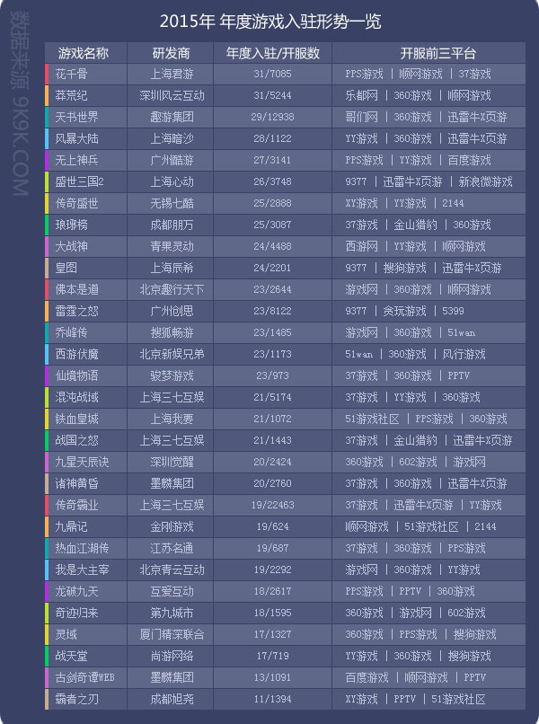 评论:本年度上海君游的《花千骨》、深圳风云互动的《莽荒纪》并列年度游戏入驻榜单第一的位置,两者都入驻31家一线平台。由青果灵动研发的《大战神》自2015年8月上线以来,入驻24家一线平台。而且在每个平台的发展趋势都十分良好,仅单单在西游网一家平台,5个月就开服2004组,平均单日开服13组的开服频率着实不简单。